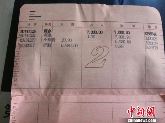 据中国邮政储蓄银行山西路支行理财经理叶青解释:“像这种情况应该是该用户之前长期账户余额低于100元钱,被银行扣掉了小额账户管理费,我们是按照一个季度3元钱的标准收取的。”从该网友的存折信息上看,7000元钱存不足三个月获得利息为1.7元钱,其中收取小额费20.9元钱,所以最终余额为6980.80元。