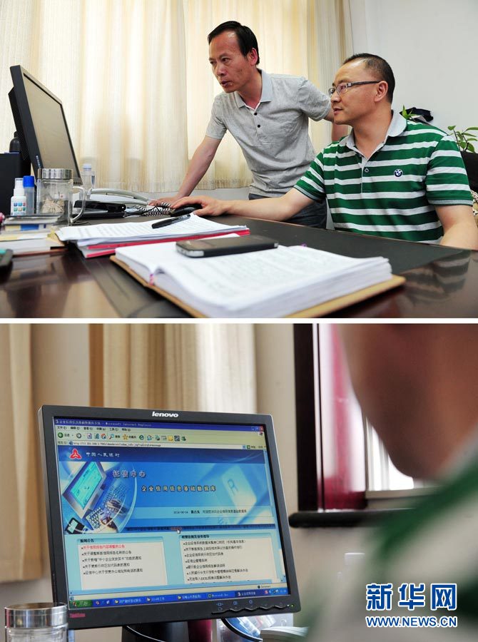 上图:在中国人民银行石嘴山市中心支行,市食品药品监督管理局的执法人员(左)在和银行的工作人员一起上传查处的食品安全信息;下图:这是在中国人民银行石嘴山市中心支行拍摄到的中国人民银行征信中心企业信用信息 ...