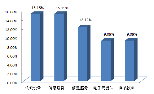 从私募基金行业配置的资金比例来看,排名前五的行业依次为机械设备、信息设备、信息服务、电子元器件和食品饮料,其中机械设备与信息设备占比均为15.15%,并列第一。