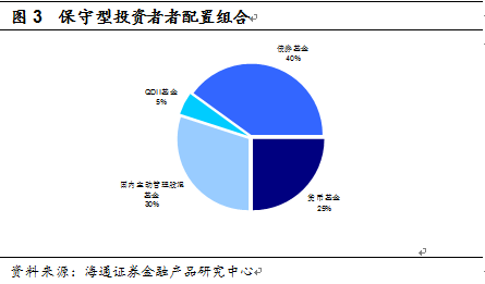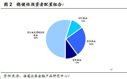 稳健型投资者:配置65%的权益类基金、25%的债券基金和10%的货币市场基金。其中权益类基金中主要以国内主动型股票混合型基金(55%)和QDII基金(10%)为主。