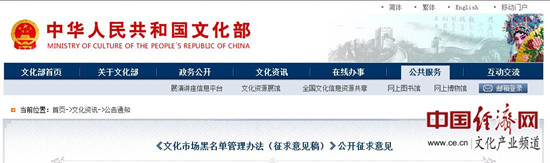 文化部网站消息,近日,文化部文化市场司草拟了《文化市场黑名单管理办法(征求意见稿)》,向社会公开征求意见。