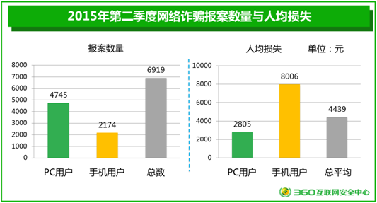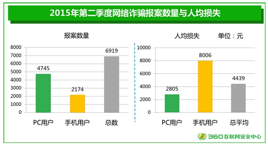 360手机安全专家指出,通过手机实施诈骗的案例是近期网络诈骗的主要形式,数量超过PC端,且花样不断翻新。据《2015年第二季度中国手机安全状况报告》数据显示,今年第二季度,猎网平台(由北京市公安局网络安全保卫总队与360联合发起成立)共接到来自全国各地的网络诈骗举报6919起,涉案总金额高达3071.7万元。其中,手机用户报案2174例,涉案总金额为1740.5万元,人均损失8006元。用户遭遇手机端诈骗时的人均损失约接近PC端诈骗人均损失的3倍。