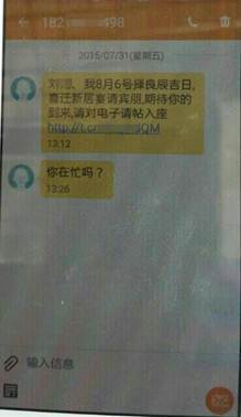 据了解,7月31日,刘先生的手机忽然收到一条由号码1821****498发来的短信,短信内容说,“(刘某某),我8月6日择良辰吉日,喜迁新居邀请宾朋,期待你的到来,请对电子请帖入座。”在短信的最后,还附有一个“电子请帖”的网址链接。