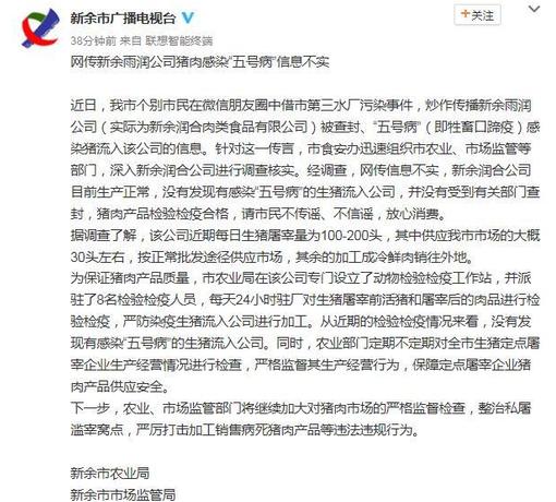 新余市农业局、市场监管局:网传新余雨润公司猪肉感染“五号病”信息不实
