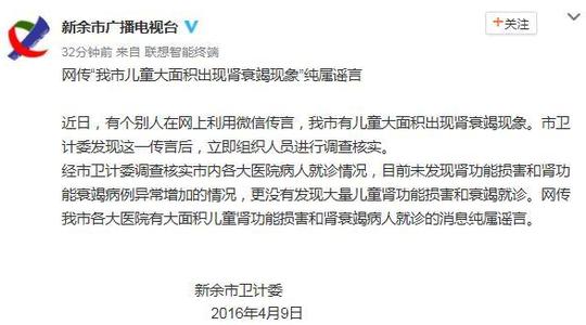 新余市卫计委:网传“我市儿童大面积出现肾衰竭现象”纯属谣言