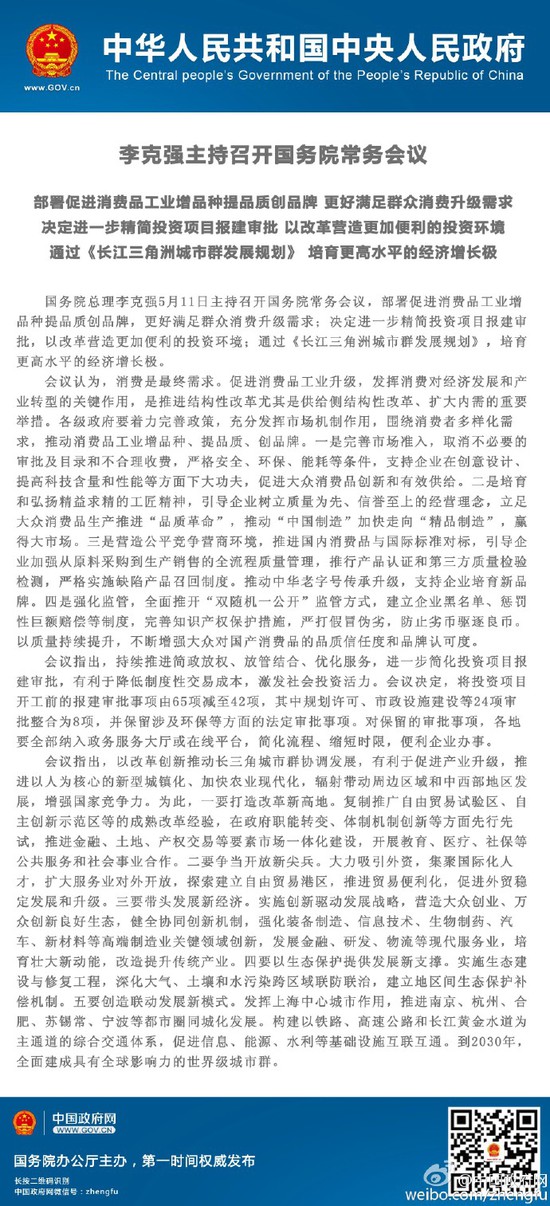 国务院总理李克强5月11日主持召开国务院常务会议,部署促进消费品工业增品种提品质创品牌,更好满足群众消费升级需求;决定进一步精简投资项目报建审批,以改革营造更加便利的投资环境;通过《长江三角洲城市群发展规划》,培育更高水平的经济增长极。
