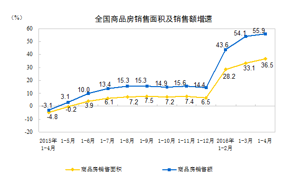 国家统计局14日公布的数据显示,1~4月份,全国商品房销售面积3.6亿平方米,同比增长36.5%,增速比一季度提高3.4个百分点,比去年全年提高30个百分点;销售额2.77万亿元,增长55.9%,增速比一季度提高1.8个百分点,比去年全年提高41.5个百分点。
