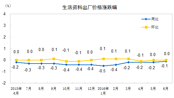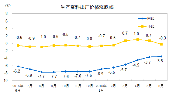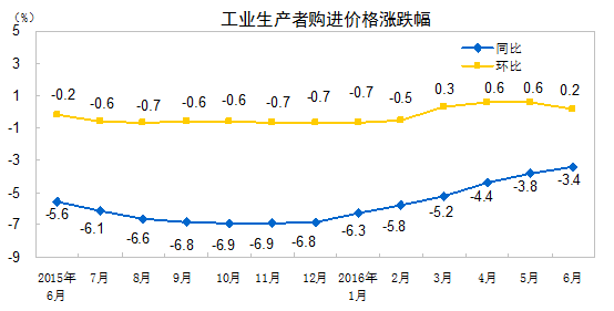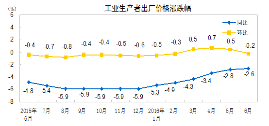2016年6月份,全国工业生产者出厂价格环比下降0.2%,同比下降2.6%。工业生产者购进价格环比上涨0.2%,同比下降3.4%。上半年,工业生产者出厂价格同比下降3.9%,工业生产者购进价格同比下降4.8%。