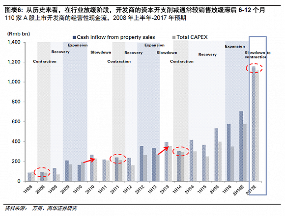 高盛高华预计房价将回落,开发商需要一定时间才能根据房地产销售现金流的收缩来调整资本开支,因此若调控政策持续严格执行6个月,预计财务压力较大的开发商将会以降价换取销量。大幅削减资本开支通常出现在行业收缩期,而非放缓期。高盛高华预计2017年开发商的经营性净现金流将降至此前2011年和2014年收缩阶段的水平,最终将引发房价下降。