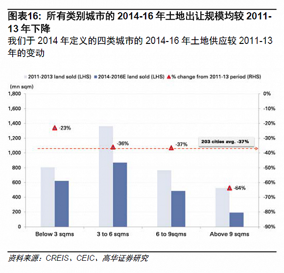 2) 200多个城市的土地供应大幅缩减,2014-2016年较2011-2013年平均减少37%。因此这些城市中土地供应偏紧或稳健的城市从2013年的130个(在全国GDP中占比56%)增至153个城市(在全国GDP中占比71%),表明供需前景改善,从而有望在长期内为稳定的房价提供支撑。