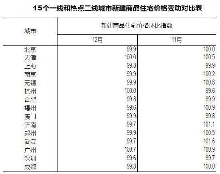 具体来看,15个一线和热点二线城市新建商品住宅价格环比指数中,其中,12个城市12月份新建商品住宅价格环比下降,降幅在0.1至0.4个百分点之间;2个城市环比持平。