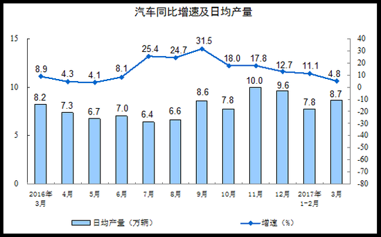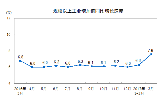 2017年3月份,规模以上工业增加值同比实际增长7.6%(以下增加值增速均为扣除价格因素的实际增长率),比1-2月份加快1.3个百分点。从环比看,3月份,规模以上工业增加值比上月增长0.83%。一季度,规模以上工业增加值同比增长6.8%。