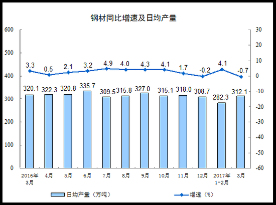 分产品看,3月份,596种产品中有430种产品同比增长。其中,钢材9676万吨,同比下降0.7%;水泥20162万吨,增长 0.3%;十种有色金属457万吨,增长4.0%;乙烯159万吨,下降2.5%;汽车269.5万辆,增长4.8%;轿车105.7万辆,下降4.8%;发电量5169亿千瓦时,增长7.2%;原油加工量4750万吨,增长5.9%。
