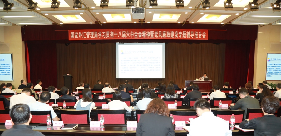 5月2日,国家外汇管理局举办学习贯彻十八届六中全会精神暨党风廉政建设专题辅导报告会。党组书记、局长潘功胜同志作主题报告,党组成员、副局长杨国中主持会议,外汇局党组成员,局机关、事业单位全体党员及中央外汇业务中心部分党员代表参加会议。
