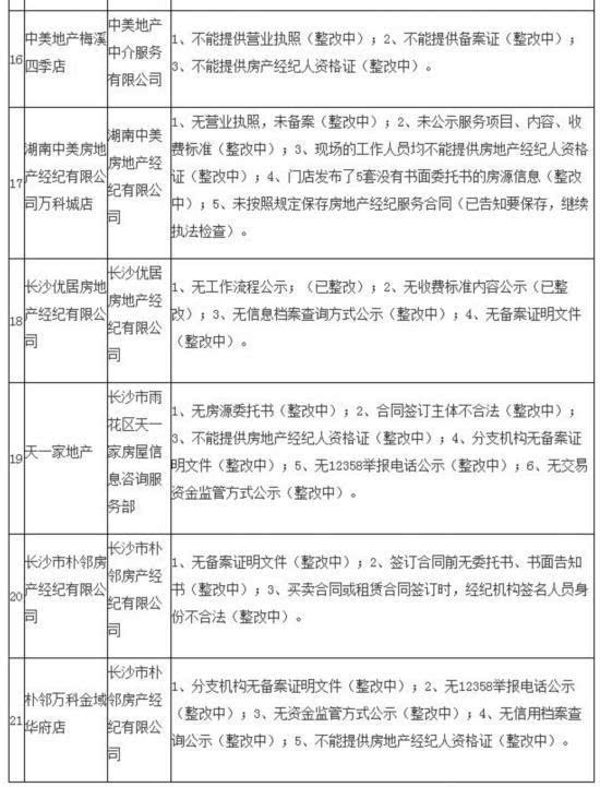 被曝光的项目包括仰天湖金峰小学改扩建工程勘察项目、仰天湖金峰小学改扩建工程设计项目、仰天湖金峰小学改扩建工程监理项目、长沙市第三、八水厂提质改造厂区土建及安装工程、长沙市轨道交通三号线一期土建SG-16标、长沙名老中医馆改造工程、麓山丰联、长沙市轨道交通三号线SG-10标、长沙市轨道交通三号线SG-11标、长沙浩通投资管理咨询有限公司荷花路分公司、中美地产梅溪四季店、湖南中美房地产经纪有限公司万科城店、长沙优居房地产经纪有限公司、天一家地产、长沙市朴邻房产经纪有限公司等。