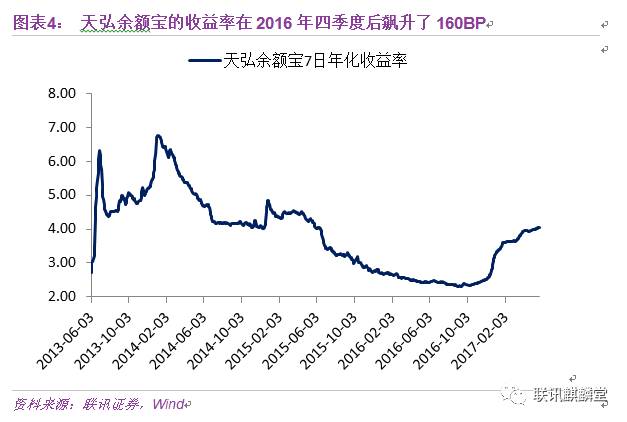 二是以同业存款、同业存单等货币市场产品为主要投资标的的货币基金收益率也开始跟随大幅上涨。以当前市场规模最大的宝类产品天弘余额宝为例,其收益率从2016年年底开始飙升,相比2016年6月末,上涨了近160BP。