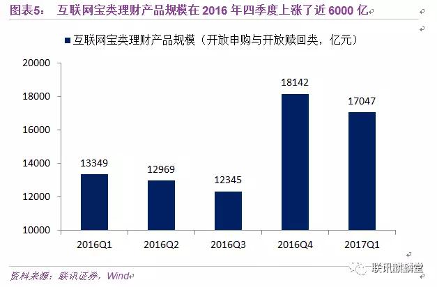 在剔除赎回与申购限制因素的扰动后,我们发现仅开放申购与开放赎回的互联网宝类产品的资金规模在2016年四季度就已大幅上涨了近6000亿,总规模达到了1.8万亿。
