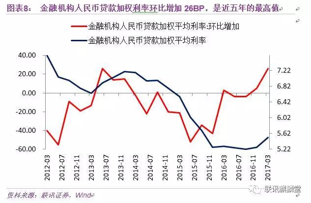 二是金融机构的加权贷款利率出现了明显的上调,从2016年年末的5.27%上涨至5.53%,涨幅26BP,这个涨幅已经是近五年来的最高值,与2013年债灾时贷款利率的涨幅持平。