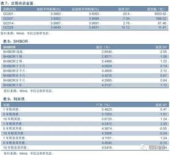 SHIBOR利率上升,非金融企业及其他部门贷款加权平均利率将会随之抬升,进而拖累非金融企业的贷款新增额,随而影响宏观经济的增长。从债市来看,目前进入一个再平衡的过程,一方面贷款的替代作用导致债券供给减少,而且贷款利率上升对经济的影响逐步体现,另一方面监管和去杠杆政策影响债券需求,供需两方面都在收缩。但应该看到需求方的影响已经逐步体现,供给和经济的影响将开始发挥作用,而且供给和经济的作用实际上是被低估了。结合各国去杠杆的经验,利率都是先升后降的,只不过顶部的判断有所不同,对于当下我国的经济和金融环境来说,我们认为利率是应该在相对合理的区间内(比如利率的上廊是央行MLF操作+40bp),那么利率在上廊的时间越长,对实体经济的负面影响也越大,所以就像今天日报所写的,贷款利率面临较大上行压力,经济面临下行压力。此时,对债券利率的思考更应该回归基本面,根据实体经济的情况,阶段推进去杠杆。对于债券来说,我们仍坚持十年期国债3.6%顶部的判断。
