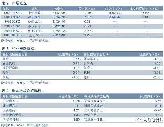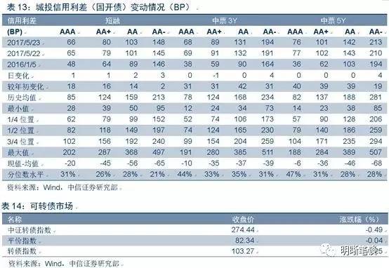 2017年5月23日,银行间质押回购加权利率大体上行,隔夜、7天、1个月和3个月期分别变动了-0.96BP、0.01BP、7.72BP、17.54BP至2.59%、2.81%、4.18%、5.03%。当日国债收益率涨跌互现,1年期、3年期、5年期、10年期国债分别变动0.47BP、-1.50BP、-1.51BP、1.24BP至3.49%、3.71%、3.72%、3.67%。上证综指下跌0.45%至3061.95点,深证成指下跌1.37%至9,763.78点,创业板指下跌1.67%至1,758.23点。