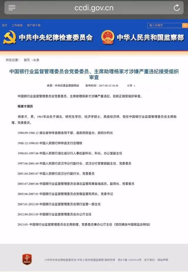 5月23日傍晚6时30分,中央纪委网站首页突出位置发布消息称:中国银行(3.660, -0.02, -0.54%)业监督管理委员会党委委员、主席助理杨家才涉嫌严重违纪,目前正接受组织审查(详见截屏图)。这一权威消息,确认了4 ...