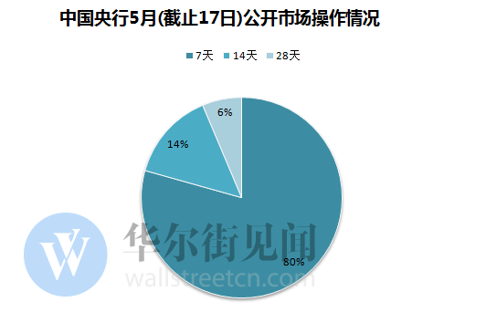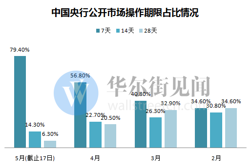 据华尔街见闻统计,5月1-17日,央行通过公开市场逆回购操作投放6300亿元,其中7天期逆回购数额为5000亿元,占比达79.4%。这一比例从2月份的35%,逐渐提升到了3月份的41%。4月份,7天期逆回购数额为5000亿元,占比进一步提升至57%。