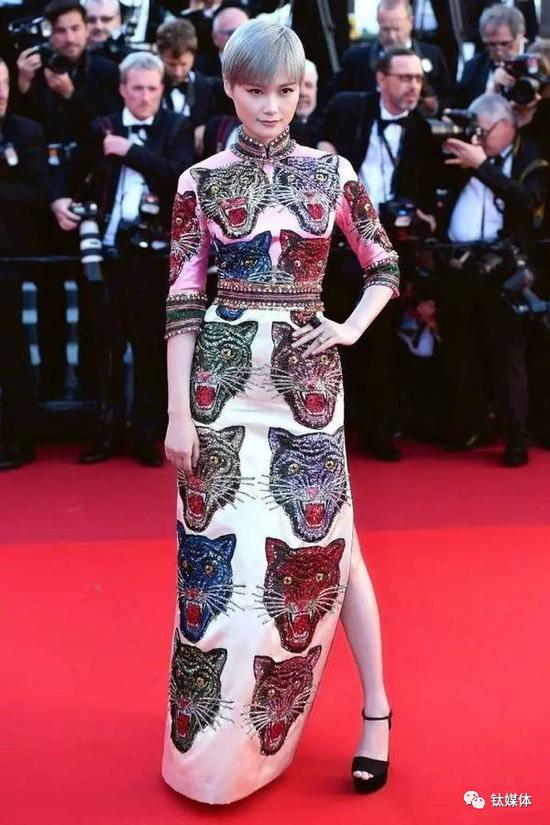 这两天戛纳的时尚风刮个不停,李宇春每出席一场活动,服装造型都能成为场上的焦点。电影《玉子》首映红毯上,李宇春穿着特别订制的Gucci粉色及白色拼接长裙,整个裙身饰以多色猫的刺绣,在领口及袖口处则缀满了彩色珍珠,复古华丽又不失气场。