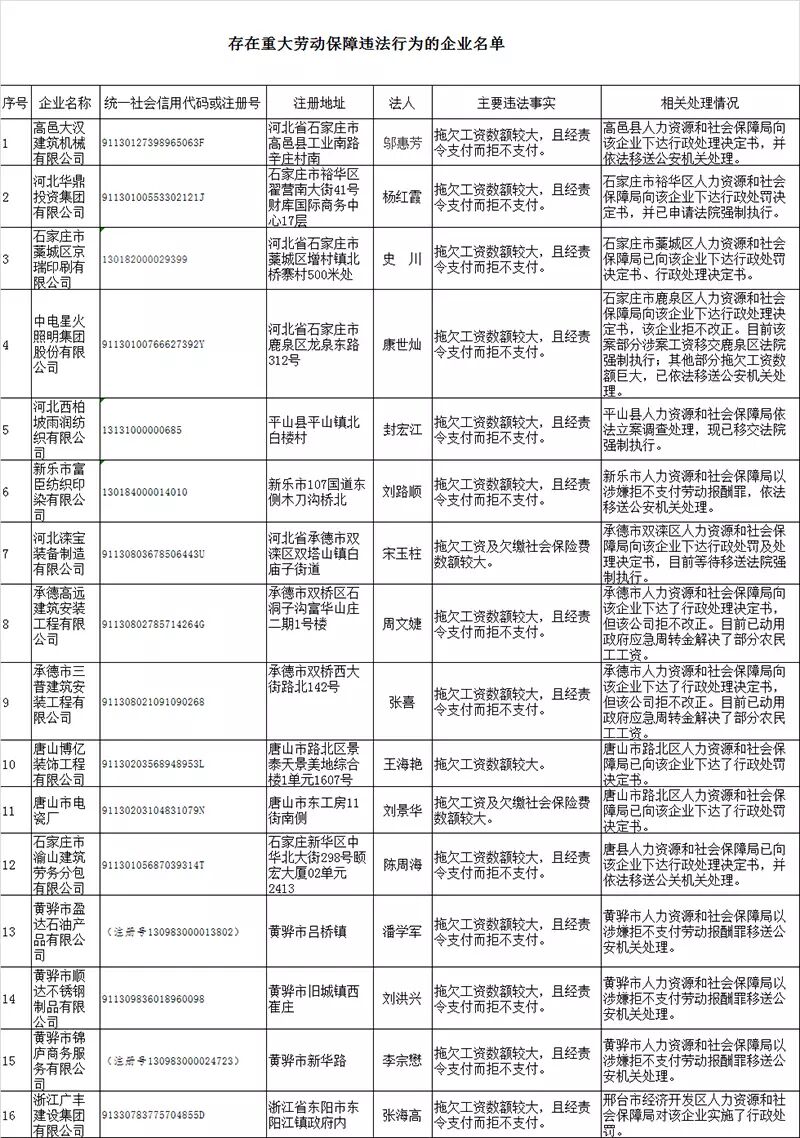 按照《重大劳动保障违法行为社会公布办法》(人力资源和社会保障部令第29号)和《河北省重大劳动保障违法行为社会公布实施办法》(冀人社规〔2016〕7号)有关规定,河北省人社厅将存在重大劳动保障违法行为的16家企业有关情况予以公布。