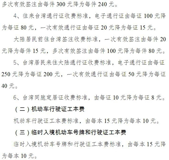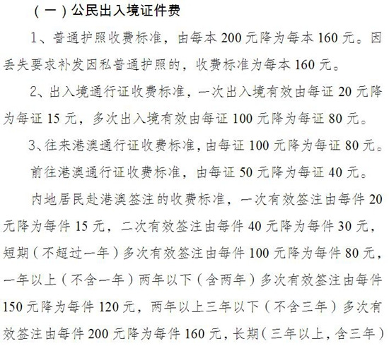 其中,多项出入境证件费下调。如,普通护照标准由每本200元降至160元,一次出入境有效由每证20元降为15元,港澳通行证由每证100元降至80元。