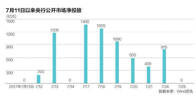 周一,央行公开市场净投放815亿元,当日资金市场利率全线回落。周二(7月25日),央行公开市场进行1000亿元7天、400亿元14天逆回购操作,当日有1300亿元7天、100亿元14天逆回购到期,完全对冲到期量。同日,银行间质押回购利率涨跌不一,短期Shibor(上海银行(19.800, 0.00, 0.00%)间同业拆借利率)小幅上涨。