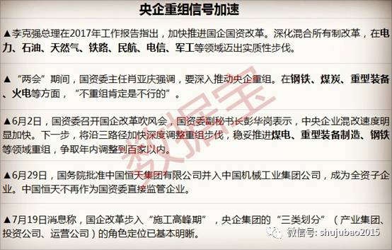 国务院办公厅印发了《中央企业公司制改革工作实施方案》,方案的目标任务是2017年底前国资委监管的重要企业(不含中央金融、文化企业)全部改制为公司制企业。国资委关于实施方案答记者问时提及的多项税收优惠政策均跟企业改制重组有关。市场观点认为,央企混改、兼并重组可能再提速。