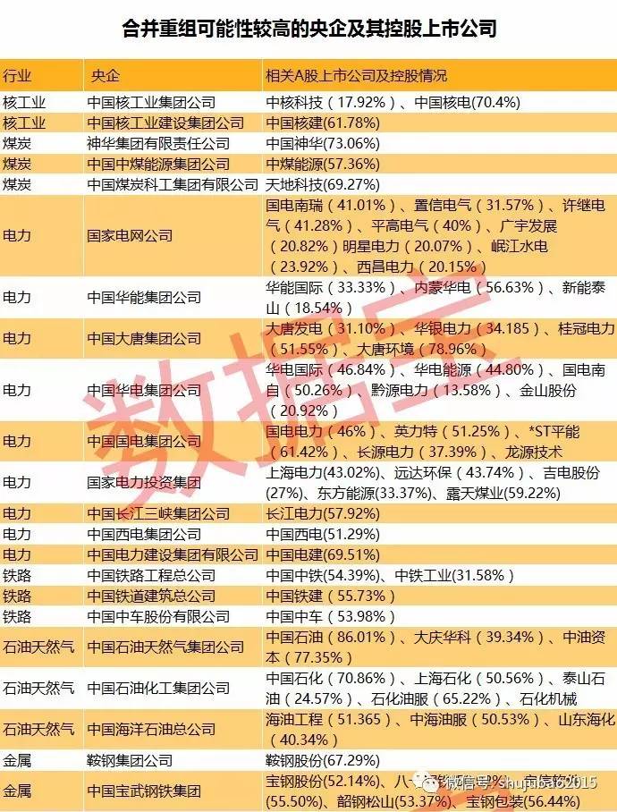 下一家合并重组的央企会是谁?从行业来看,煤电、石油、天然气、钢铁、军工等在多次会议被提及。根据中金公司关注的合并重组可能性较高的行业,数据宝统计了对应的央企以及这些央企直接或间接控股的相关A股上市公司。